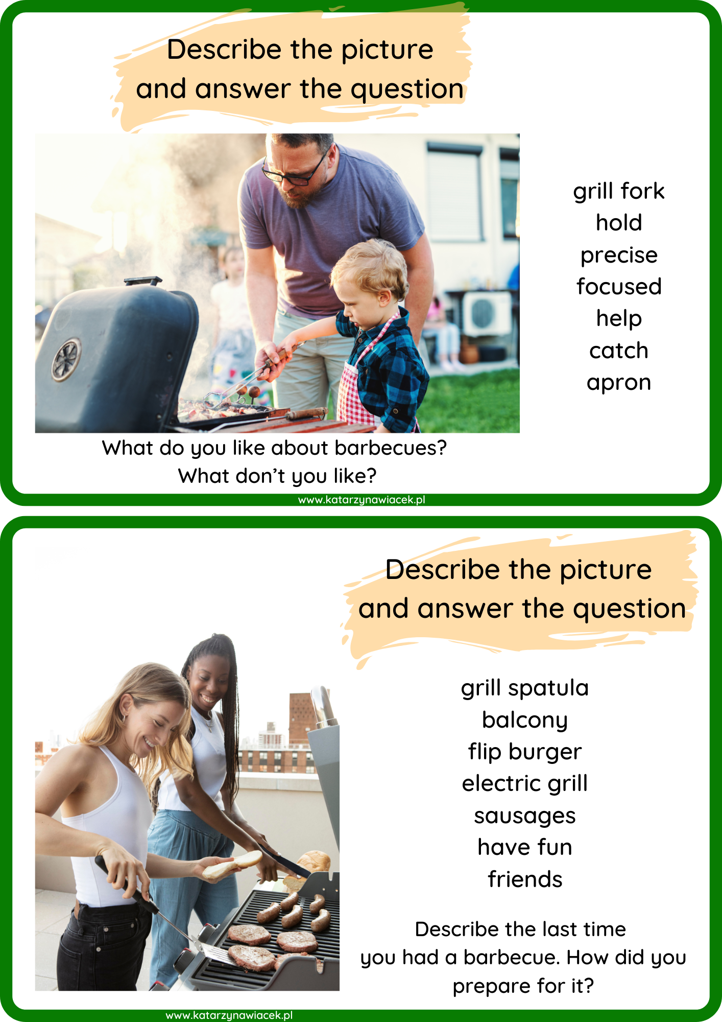 Barbecue set to zestaw na mówienie, który najlepiej sprawdzi się na poziomie A2-B1 (na poziomie B2 zasłoń słówka do opisu obrazka i skup się na dyskusji). Dla kogo? Dla uczniów dorosłych i starszych nastolatków (szkoła średnia).