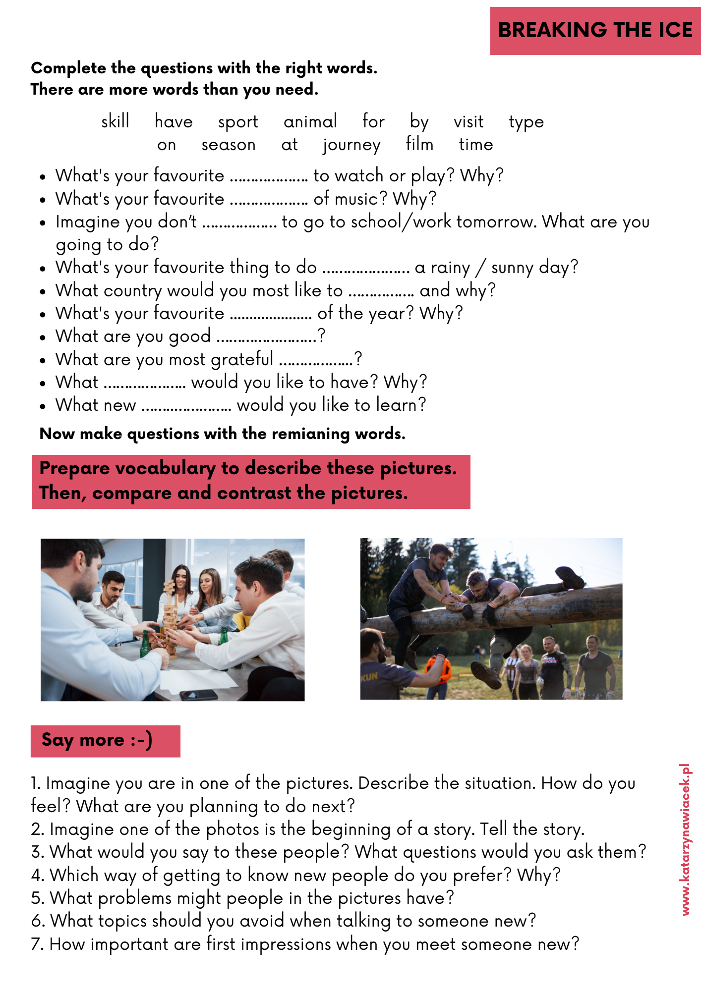 Breaking the ice przyda Ci się dla uczniów na poziomie A2-B1, a nawet z uczniami przygotowującymi się do FCE (szczególnie zadanie 2 i 3). To materiał, dzięki któremu uczniowie na bazie obrazków rozwijają słownictwo i mówienie i poznają się lepiej.