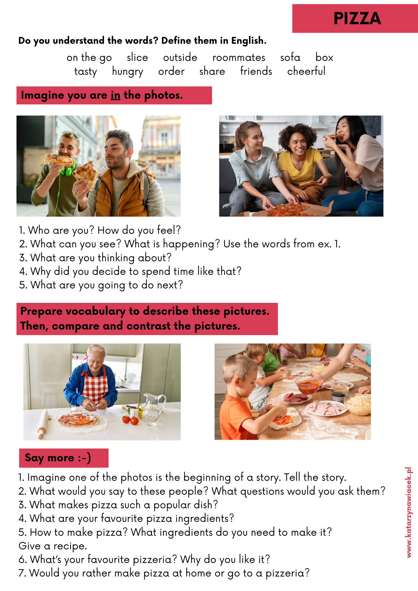 Pizza Imagine & Speak to karta pracy na poziom A2-B1. To materiał, dzięki któremu uczniowie na bazie obrazków rozwijają słownictwo i mówienie. Pizza zawiera: