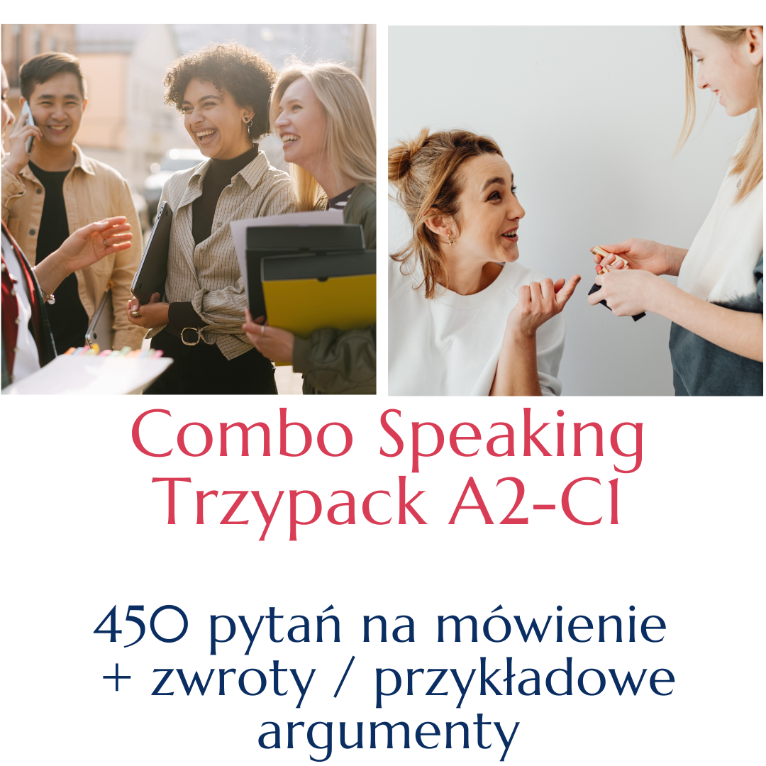 Trzypack Combo Speaking A2-C1 to zestaw 450 pytań do dyskusji wraz z pomysłami na argumenty / zagadnieniami do poruszenia oraz zwrotami do użycia. To trzy materiały w jednym (Combo speaking A2, Combo speaking B1-B2 i Combo speaking C1).