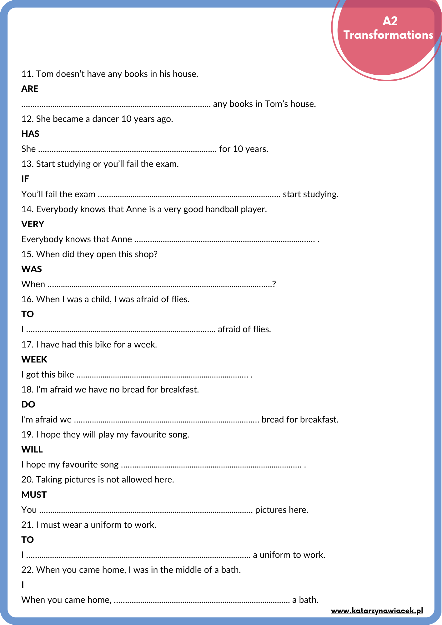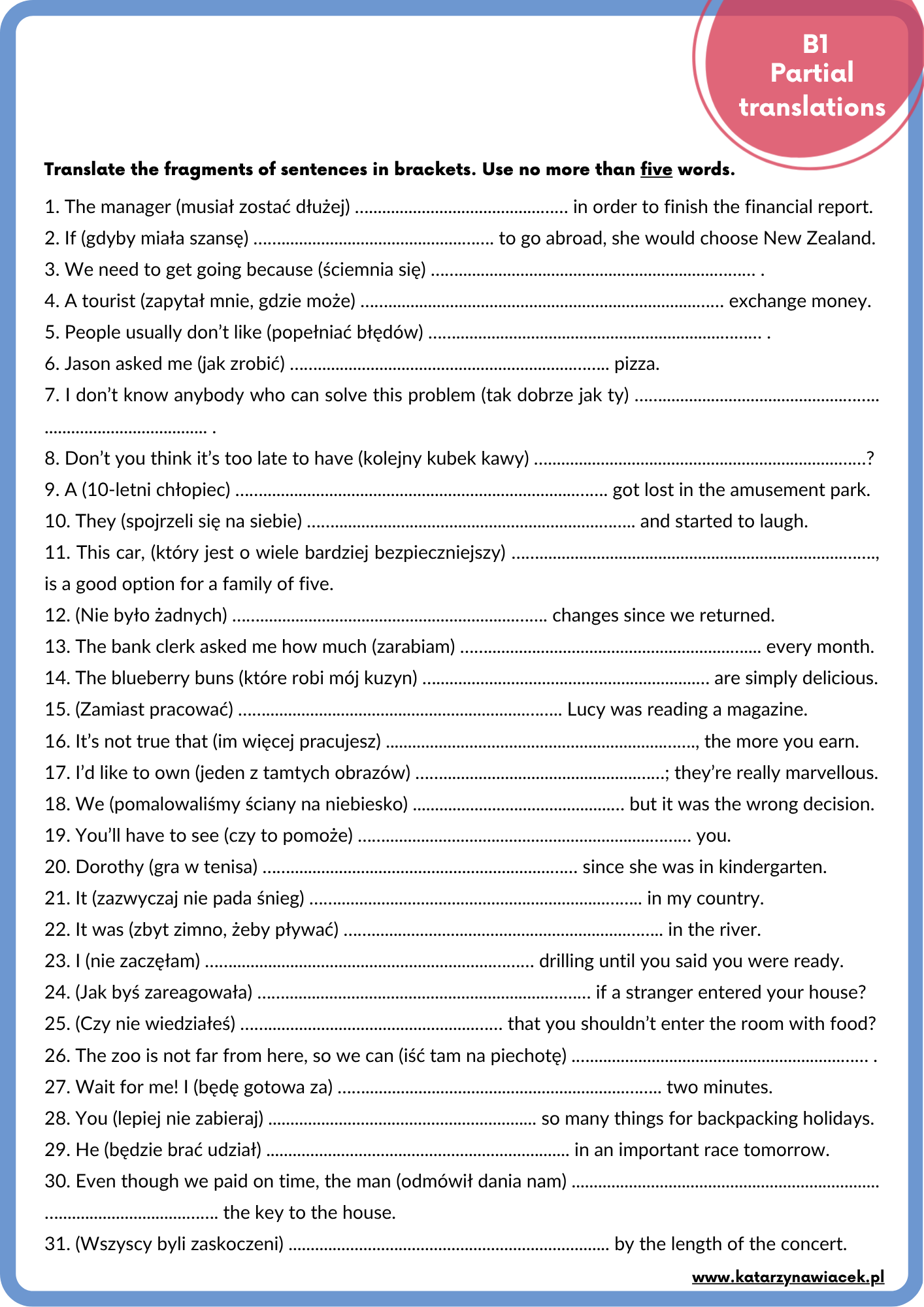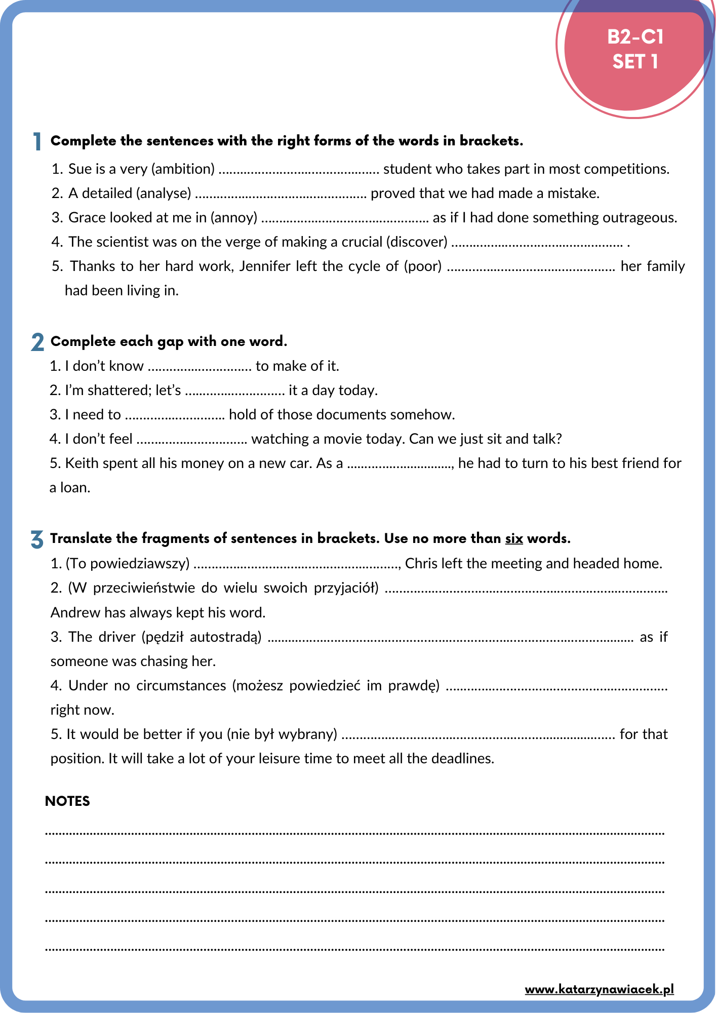 – w każdym zestawie 5 zadań: na tworzenie wyrazów, gramatykalizację, częściowe tłumaczenia, transformacje i uzupełnianie luk
