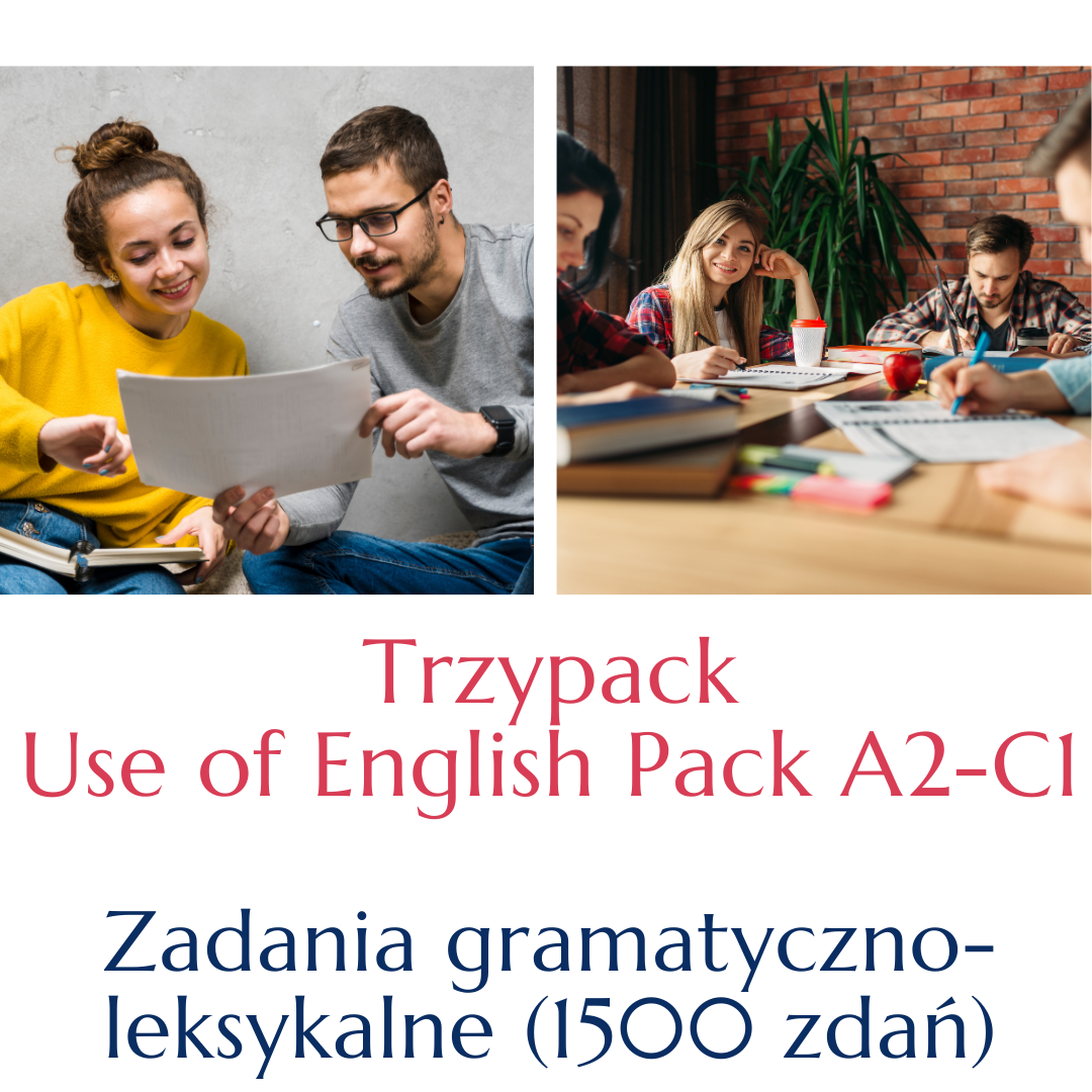 Trzypack Use & English A2-C1 składa się z trzech poziomów: A2, B1 i B2-C1. To idealny zestaw do rozwijania zadań na struktury do E8, matury na poziomie podstawowym, rozszerzonym i dwujęzycznym