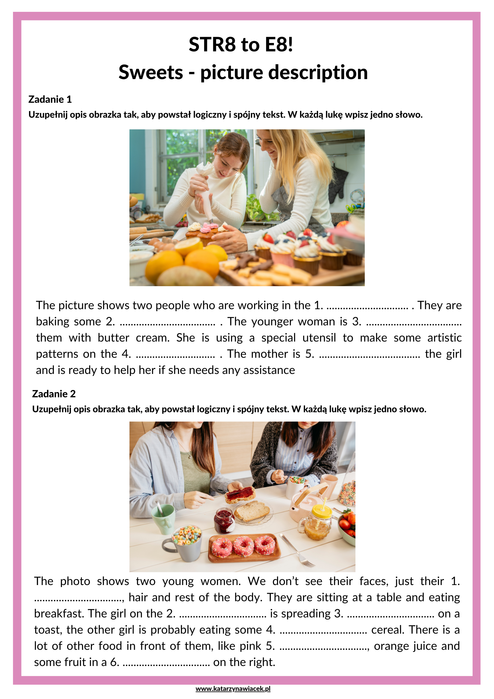 W zestawie Sweets znajdziesz sześć obrazków, do każdego z nich jest opis z lukami
